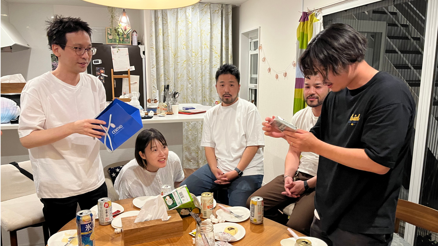 今回の合宿が最終出社日となるメンバーにはケーキとプレゼントを渡しました!