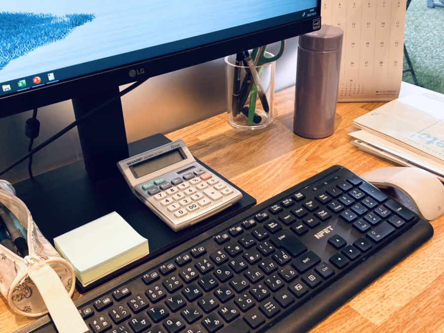 ▼Hさんのデスクです。電卓とペンとノートは必須だそう。
