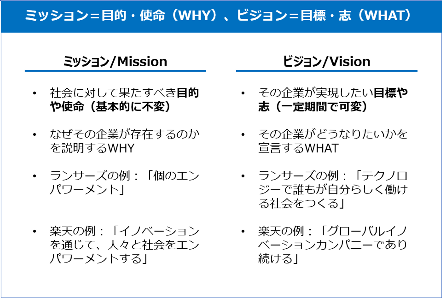 ミッションとは目的・使命を問うWHY、ビジョンとは目標・志を表すWHAT