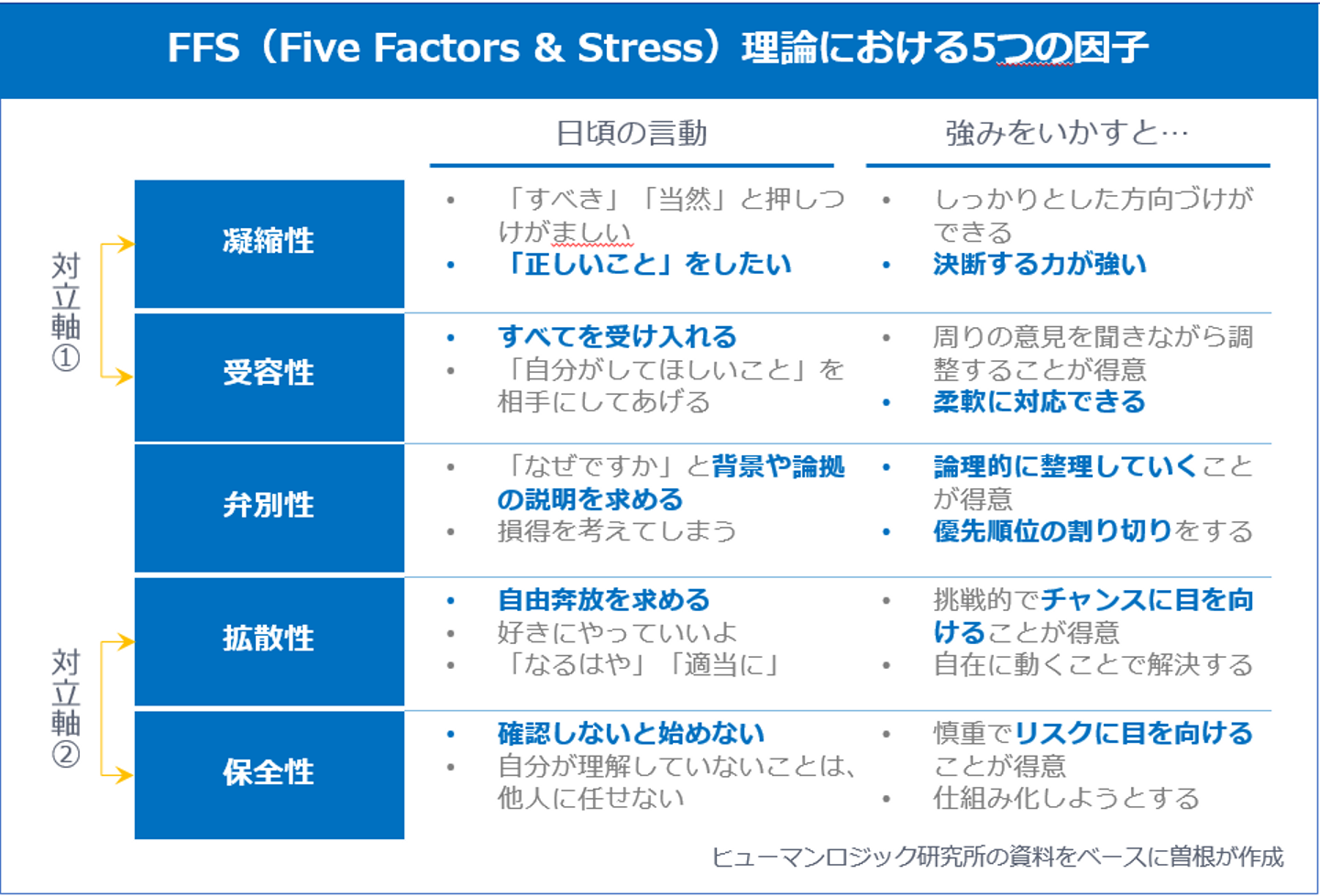 チームの関係性をつくっていくうえで、最近ランサーズで導入したのは、ヒューマンロジック研究所の提唱するFFS(Five Factor Score)理論を応用した性格診断テストのようなものです。