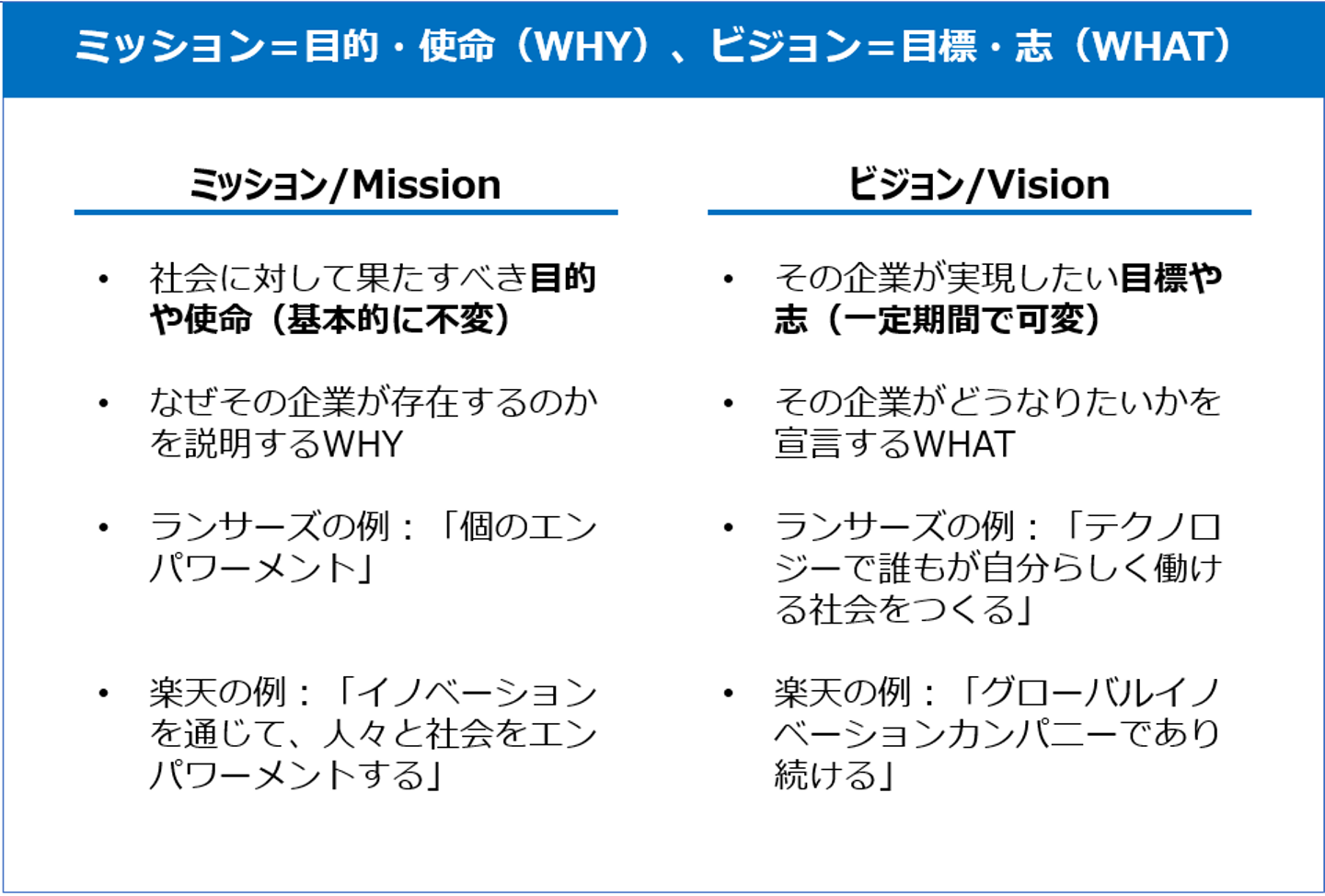 ・ミッションとは目的・使命を問うWHY、ビジョンとは目標・志を表すWHAT