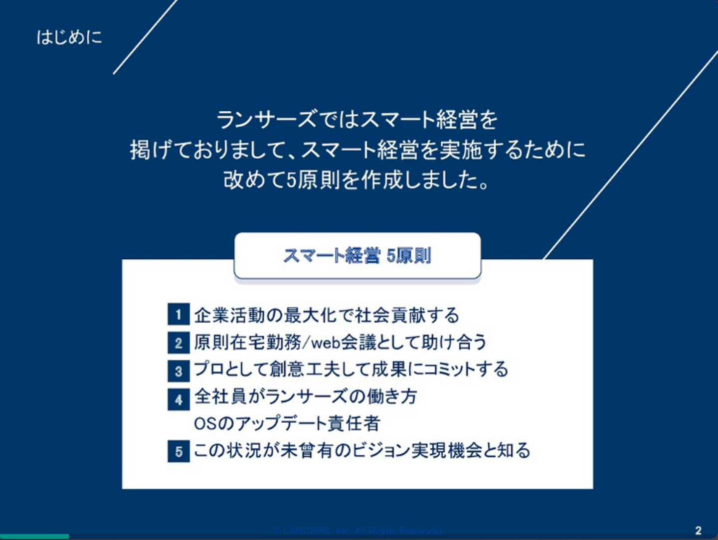 事業の社会的意義や、一人ひとりが主体性を持ちプロフェッショナルに業務を行うなど、ランサーズらしさが溢れています。そしてリモートだと忘れがちな部分の再確認にもなります。