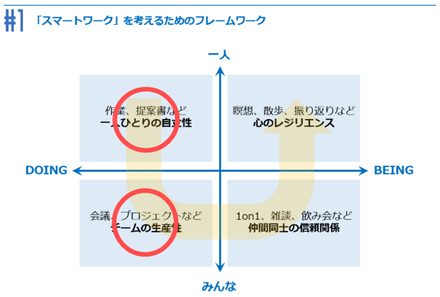 そんなたくさんの施策の中から、そねせんのスマートワークの資料を用いて、今回は「チームの生産性」と「一人ひとりの自立性」をサポートする施策をご紹介いたします。