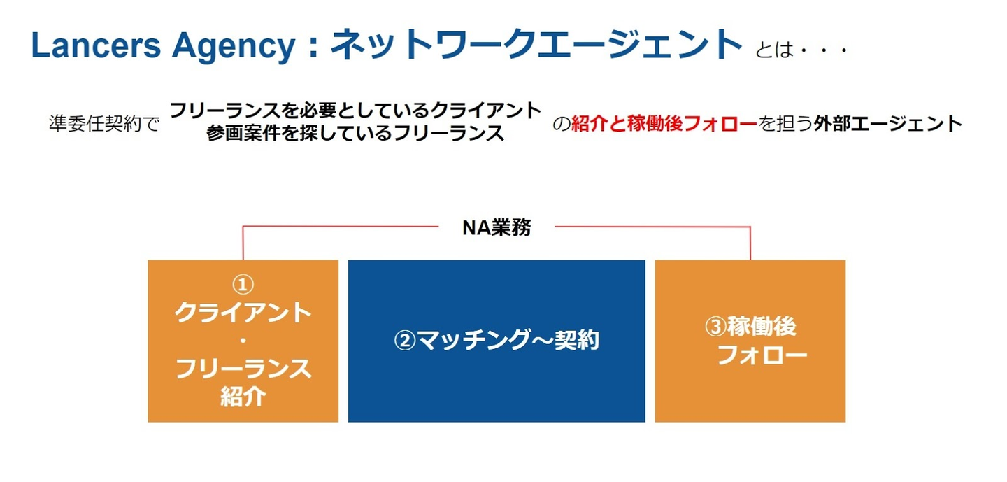 現在企業への営業活動は社員がメインに行っていますが、「ネットワークエージェント」の取り組みが広がっていくことにより、ランサーさんも営業のような立ち位置として動く事が可能になり、ご自身の活動や報酬の幅を広げていく一環にも繋がることになります。