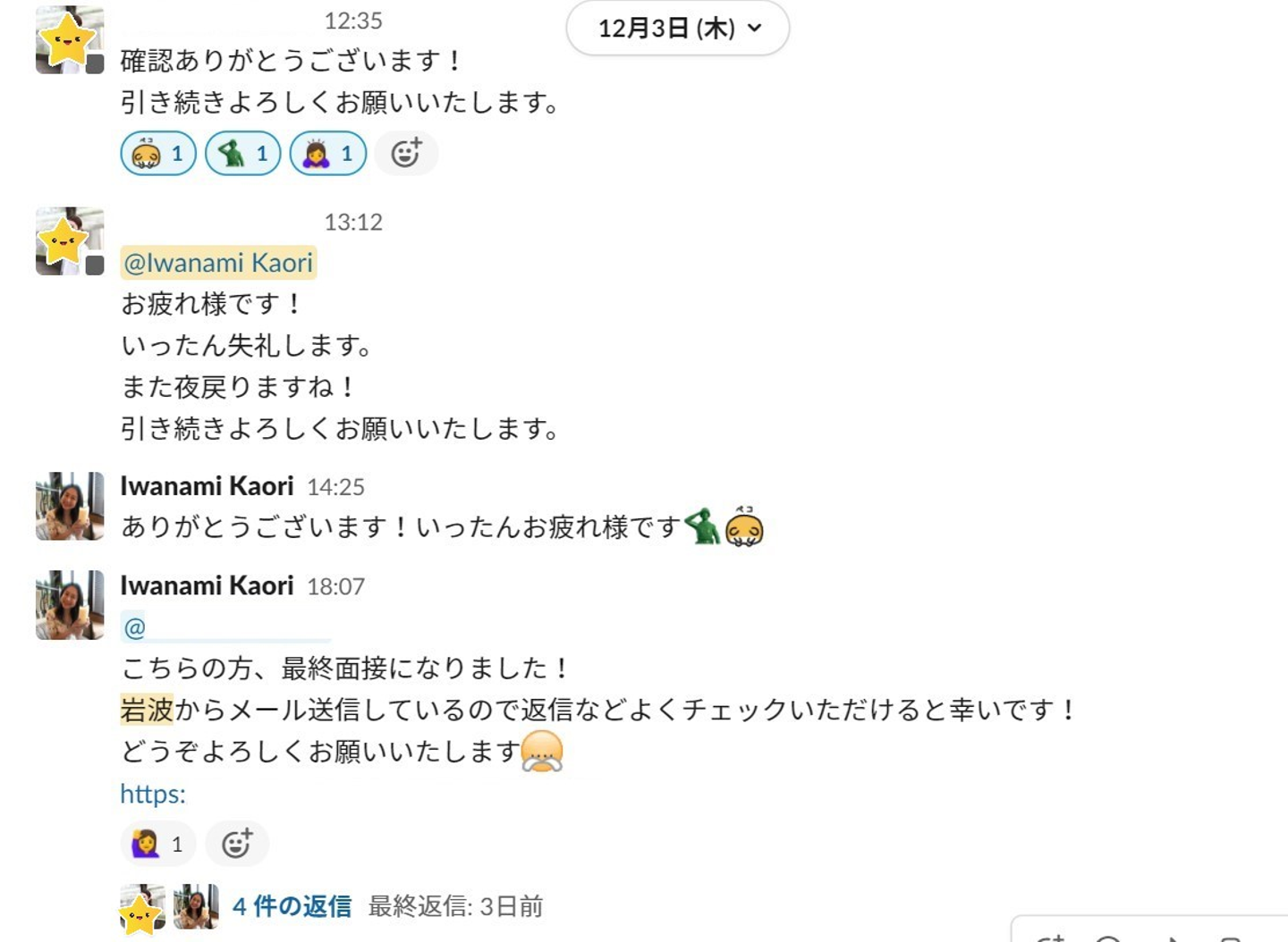 お二人とは機密保持契約やセキュリティ基準の確認をさせていただいた上で、各採用ツールのアカウントを発行し、日程調整業務、スカウト業務をお願いしています。すべての業務オンラインで行っていただいているので実はまだ一度もお会いしたことがありません!だからこそこまめなコミュニケーションを心がけています。お二人ともレスが本当に早く、ときにはより良い進め方や方法を提案いただくことも。一度もリアルで会ったことがないとは全く思えません。また、適宜事業側の担当者とつないでランサーズ自体のことを知ってもらうことを心がけています。