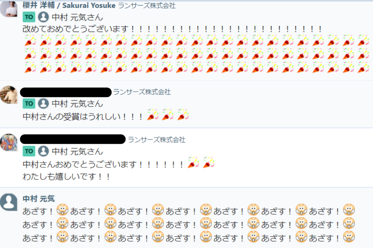 受賞時、事業部用チャットは大盛り上がりのようでした!