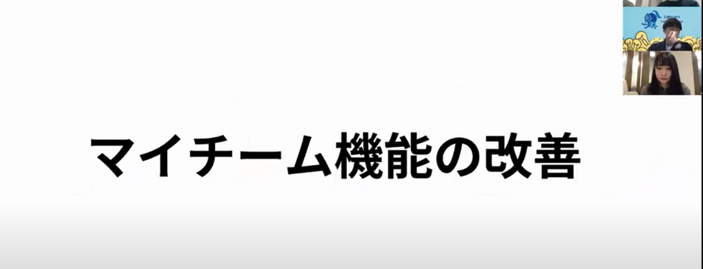 実際のデータからマイチームがどれだけ活用されているか、マイチームが活用されるとどんなメリットがあるか、そこから現状の課題の洗い出しと解決方法・施策を発表。改善パートでは具体的にどんな流れでUIになるかも詳しく説明いただきました。
