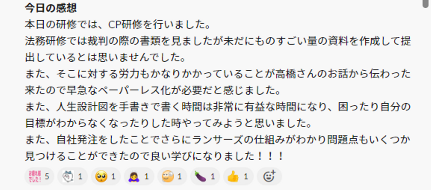 事業・サービスだけでなくCP(コーポレート)研修も実施。日報に対してスタンプリアクションもかなり多かったです!