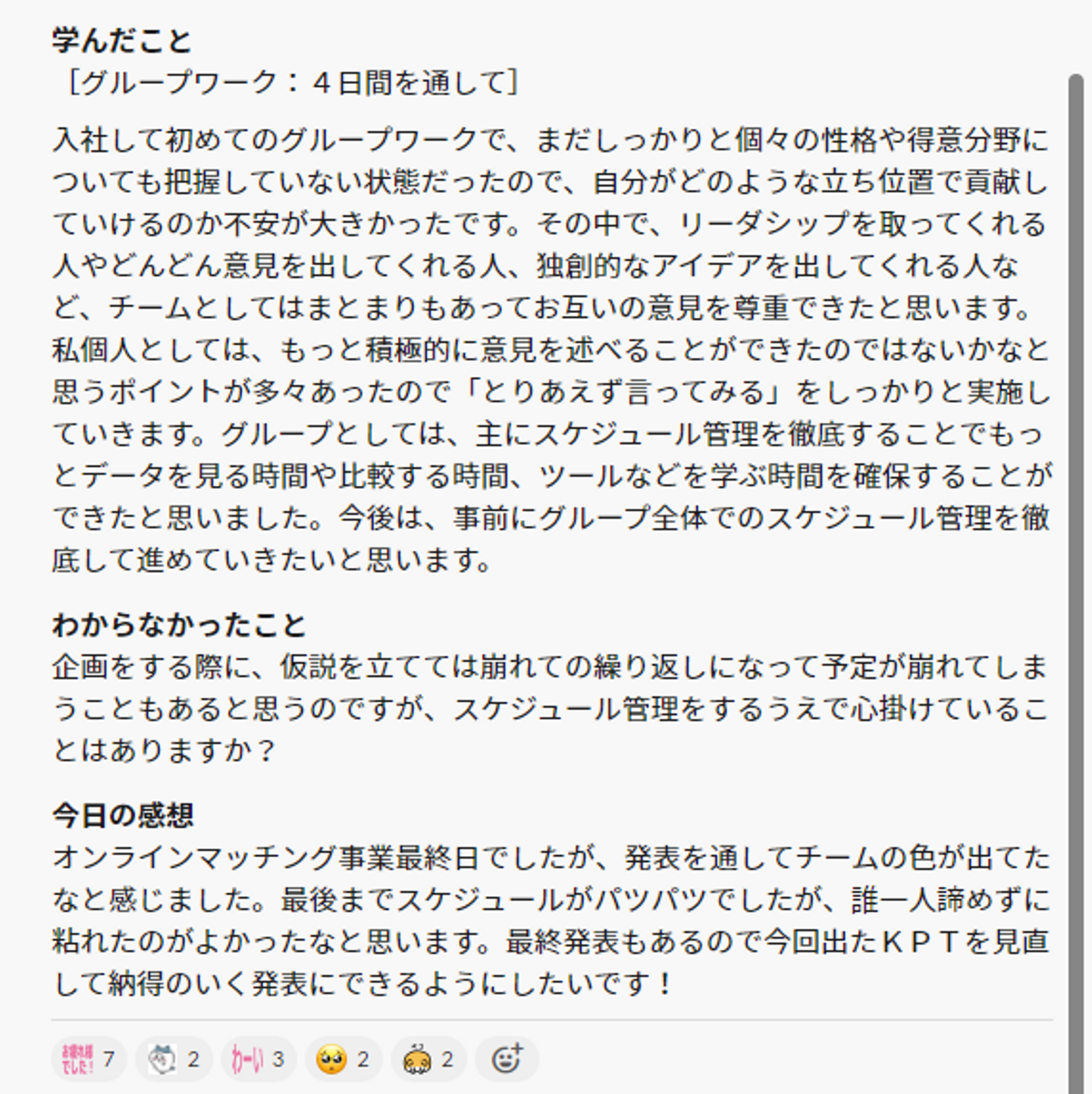 1日の終わりにはそれぞれのメンバーに日報を更新してもらってましたので、研修の様子を垣間見ることができました!