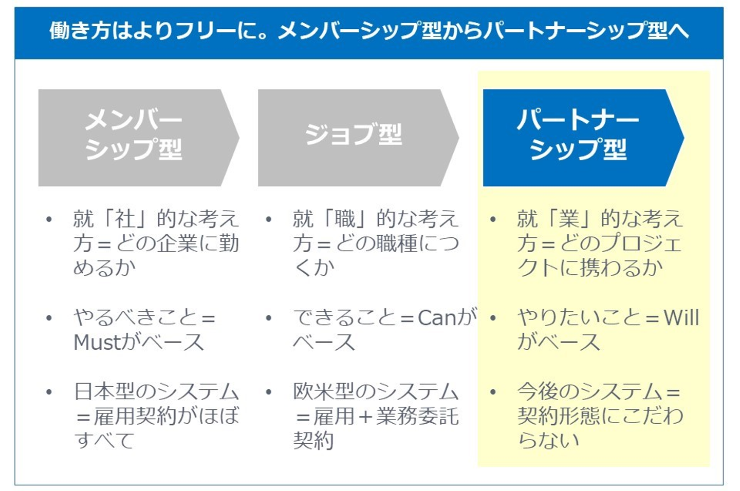 別の表現の仕方でいうと、旧来の日本で中心的な「メンバーシップ型」の働き方から、欧米で中心的な「ジョブ型」と言われる働き方、そして「パートナーシップ型」と呼ばれる働き方への移行が進んでいくのではないか、と。