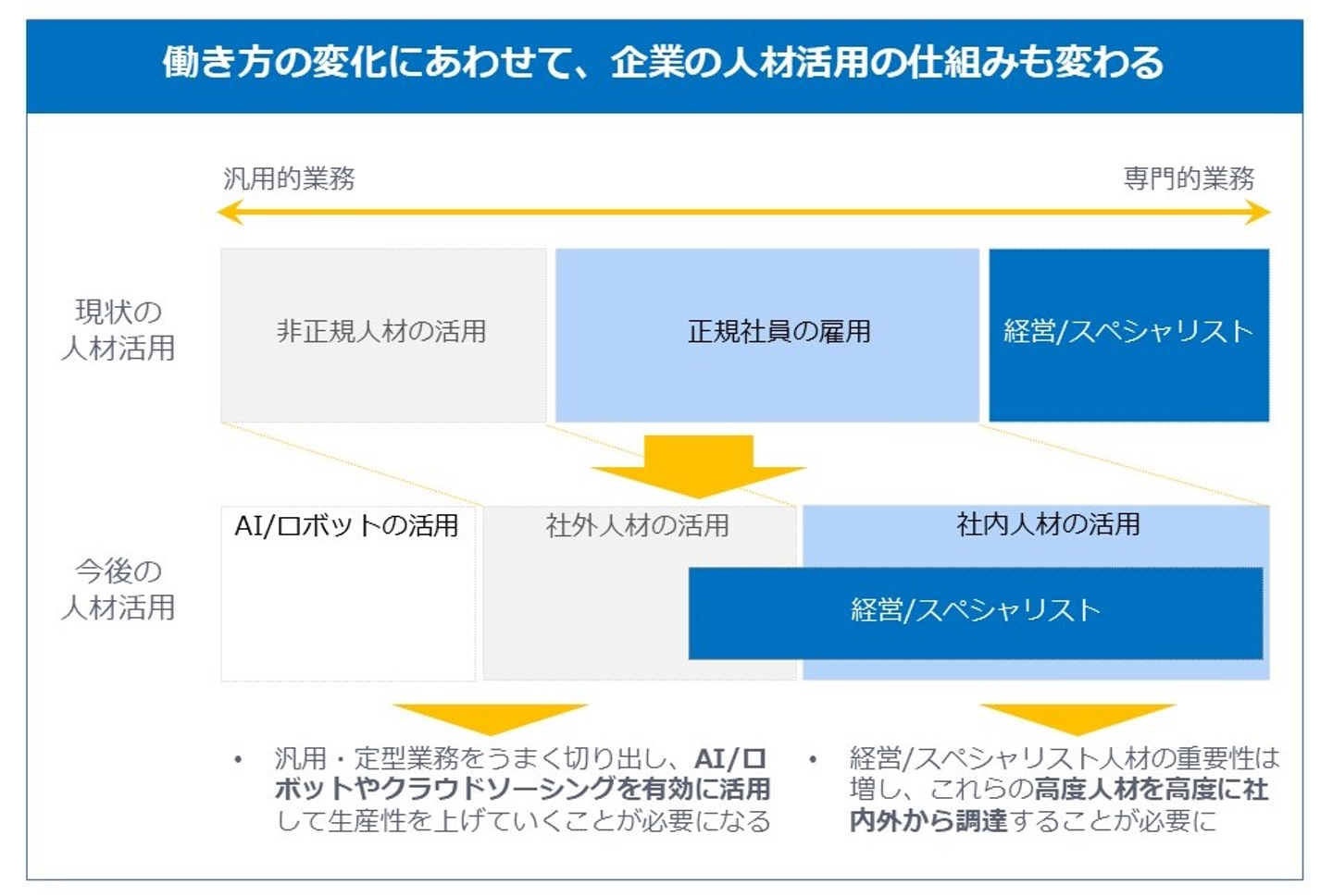 AI/ロボット、社外人材、社内人材をうまくミックスし、汎用的・定型業務を切り出してそこでうまくAIを活用する。それによって企業は、専門的・非定型業務に人材を投下できるようにする。さらに、これを社内だけでなく社外も含めた形で進める仕組みをつくることがこれからの時代において重要になってくるのではないでしょうか。
