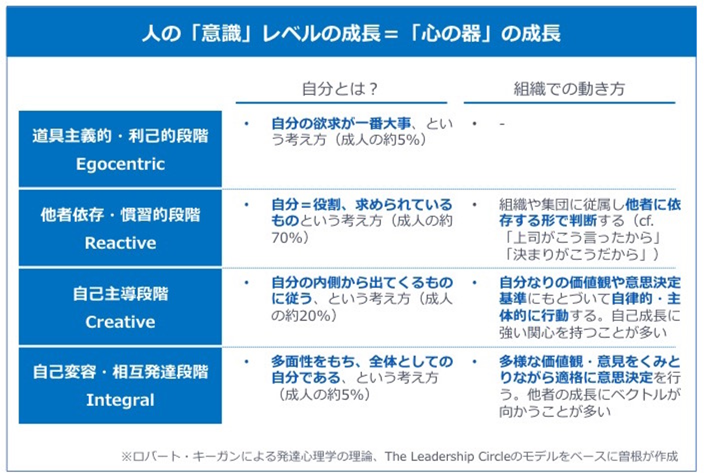 そのコーチングのベースとなっていたのが、ロバート・キーガンというハーバード大学教授の発達心理学の理論。成人の「意識レベル」を以下の4つに分けています(詳しくは加藤洋平氏の『組織も人も変わることができる!なぜ部下とうまくいかないのか 「自他変革」の発達心理学』を読むとわかりやすいです)。
