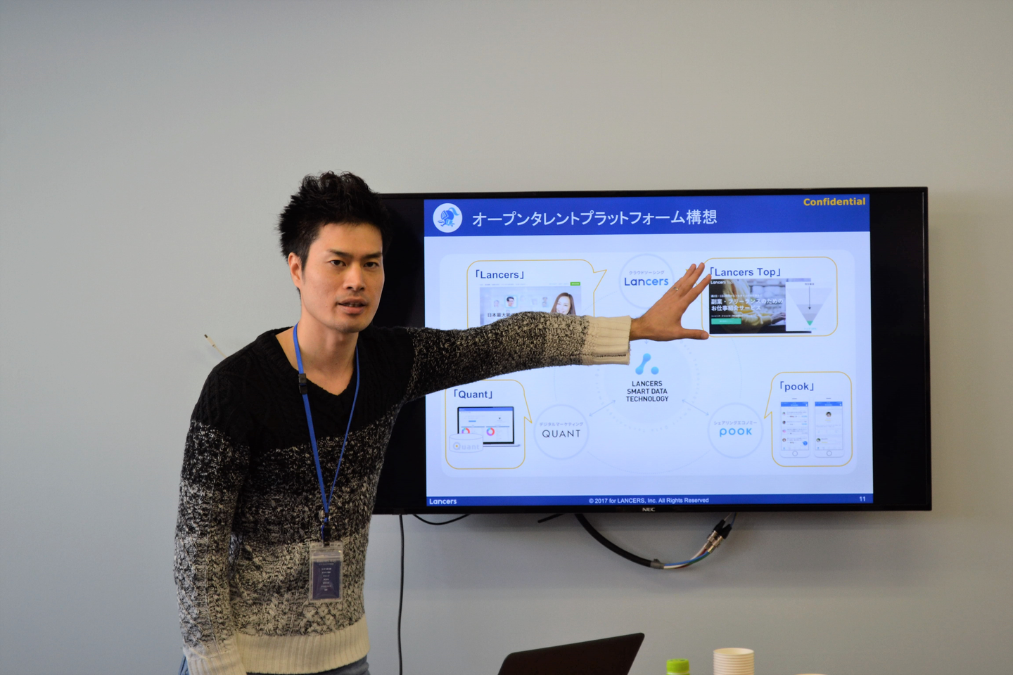 Welcome Partyでは、メンバーの交流はもちろんのこと、他にもランサーズの歴史や事業、カルチャーや働く環境についてなども、少しでもお伝えしたい!という思いのもと作られた機会でした。ということで、交流をしながら、お馴染みの「そねせん」こと取締役CSO曽根からの事業説明や、人事からオフィスツアーのパート等も行いながら、会は進行しました!