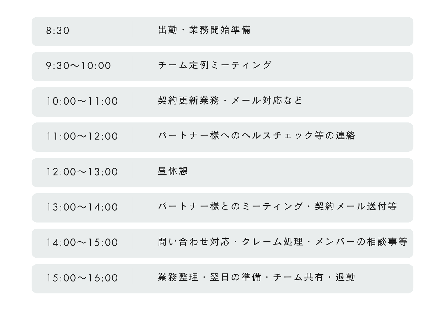 1日の仕事の流れとしては、朝は8時半くらいから準備を始め、9時半にチームの定例ミーティングを開催しています。 その後は、契約更新への対応や稼働していただいているBPさんとのミーティング、外部とのメール対応などをこなしています。