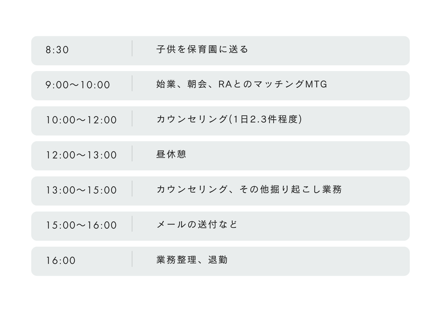 1日の流れとしては、朝は子どもを保育園に送り、9時から業務を開始しています。朝会でスケジュールを確認し、日中はカウンセリングを2〜3件ほど担当しています。