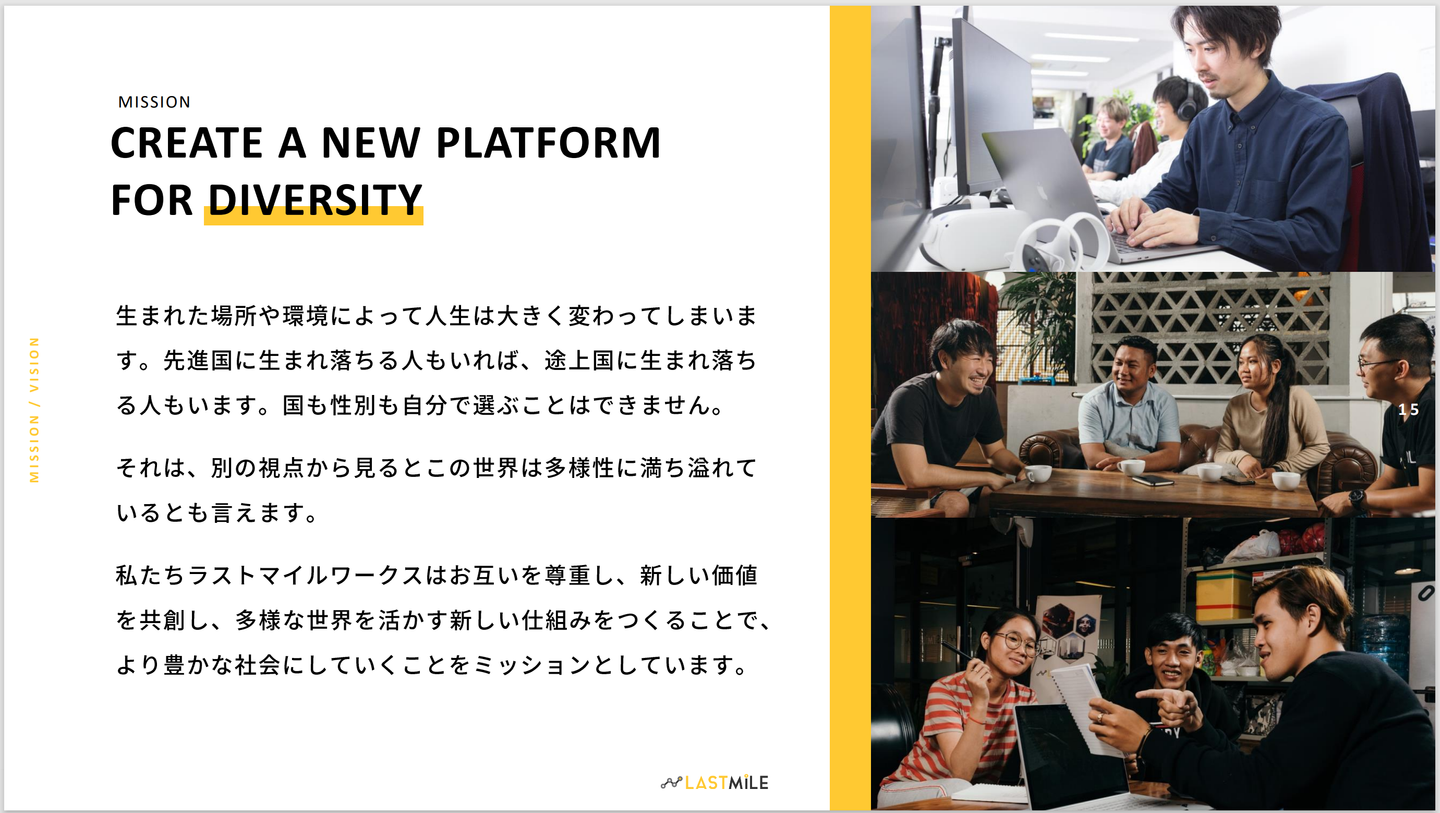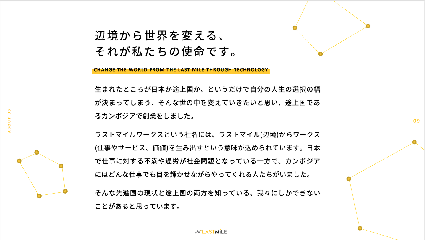 カンボジアで立ち上がり、日本、ベトナムと拠点を広げてきた軌跡や、ラストマイルワークスの使命についてのパートです。