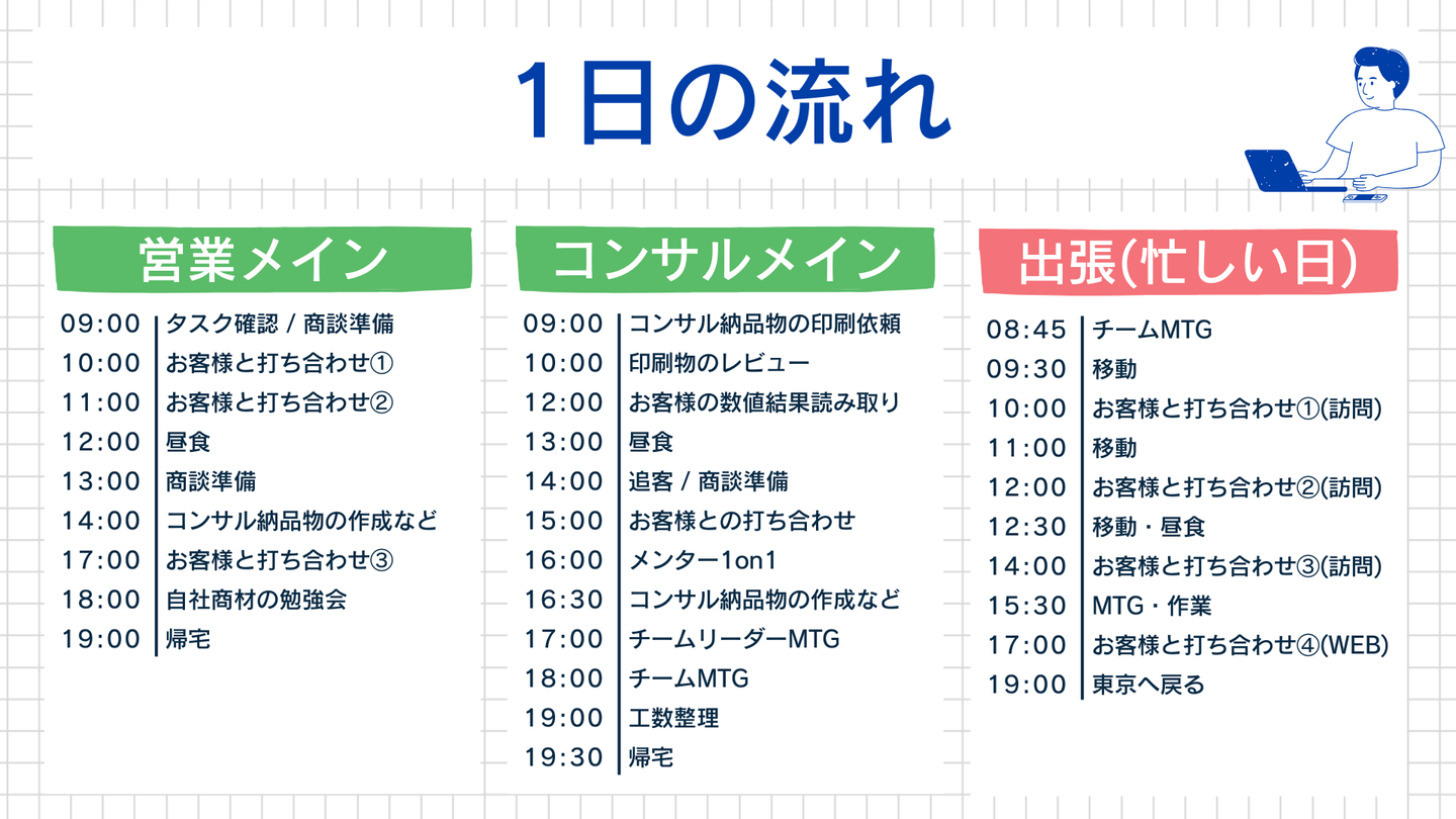 通常は、1日にお打ち合わせを2,3件、コンサルティング・深耕案件の準備と、商談準備、メンター1on1を3名(社員2名/内定者1名)、提案済みのお客様とのコミュニケーションが主な流れになります。ここにコンサルティングの納品物確認とかが入ると、忙しくなりますね。