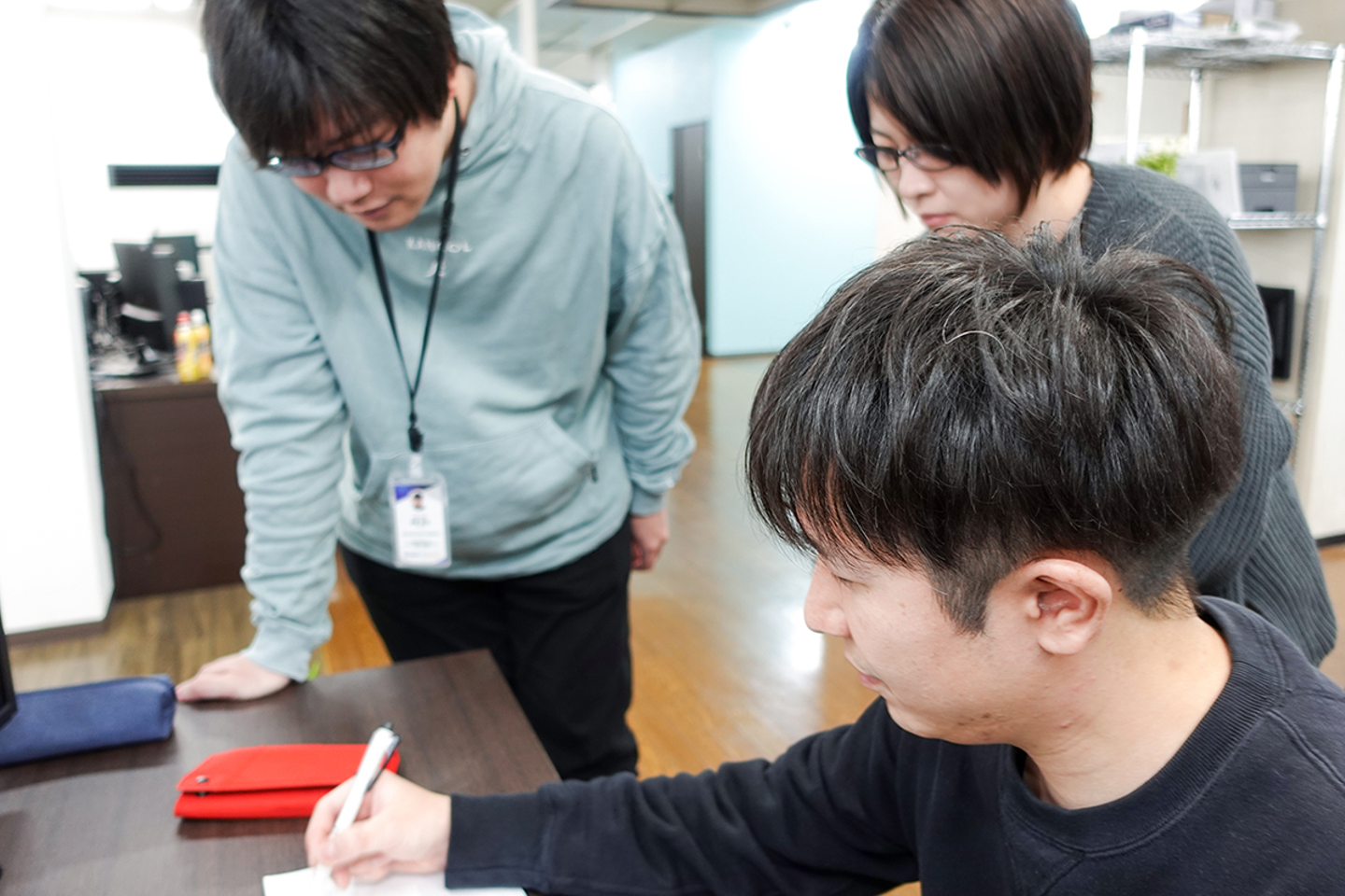 チーム毎に集まって「進捗の確認」や「仕様の確認」をしています。