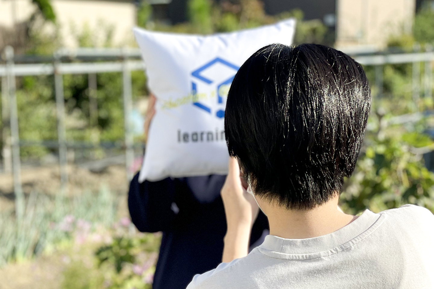 本社裏のたつの市の田園風景を背景に、ノベルティの一つであるクッションを撮影している2人を、背後から津田がこっそり撮影しておりました。笑