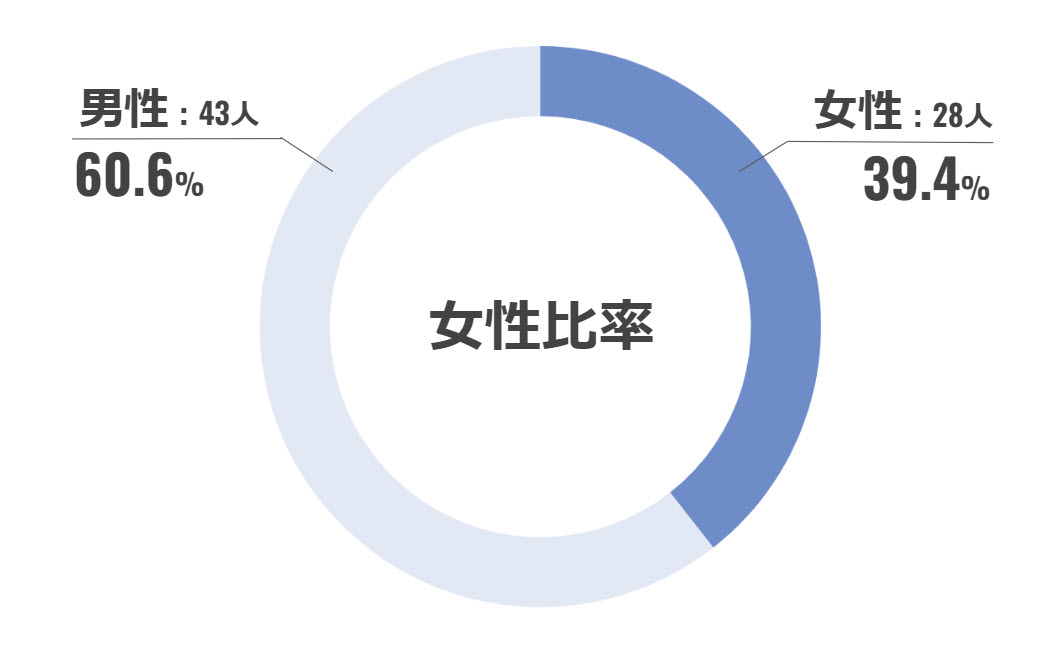 エンジニア職に関してはまだまだ女性は少ないですが、2021年からビジネス職の採用の強化も行っていますので、女性の割合が増えている状況です。
