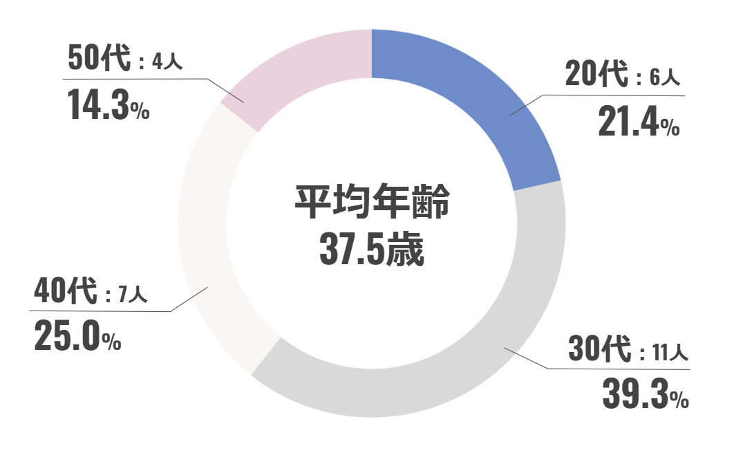当社全体の平均年齢は現時点で35.1歳ですが、女性のみの年代別人数と平均年齢は以下の通りです。