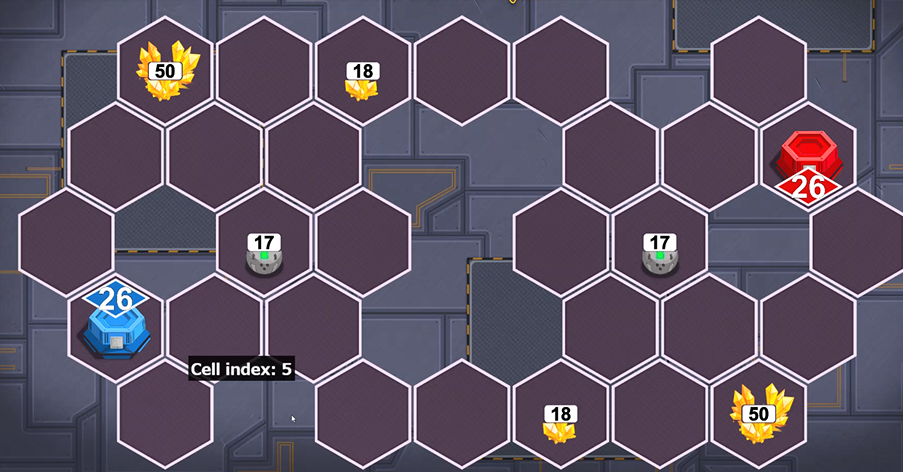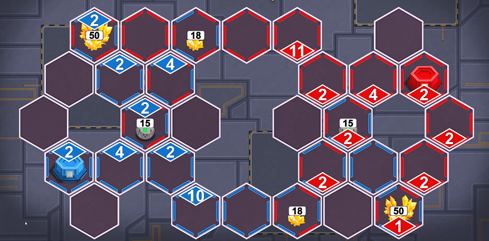 フィールドが点対称なので、お互いのベースから等距離にあるマスの資源を確保することが勝敗に直結することは想像に難くありません。
