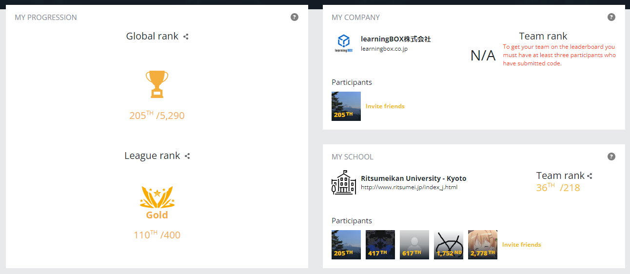 全体で 5290人中 205位 でした。上位4%くらいなので、悪くないです。