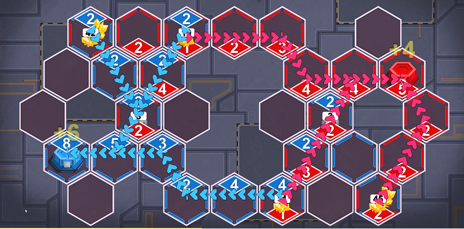 自軍のベースから資源までの経路が繋がると資源を獲得でき、たくさん獲得した方が勝ち!というゲームです。