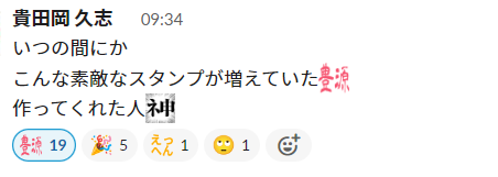最近では、当社のデザイナーがSlack内に「豊源」スタンプまで作ってくれました!