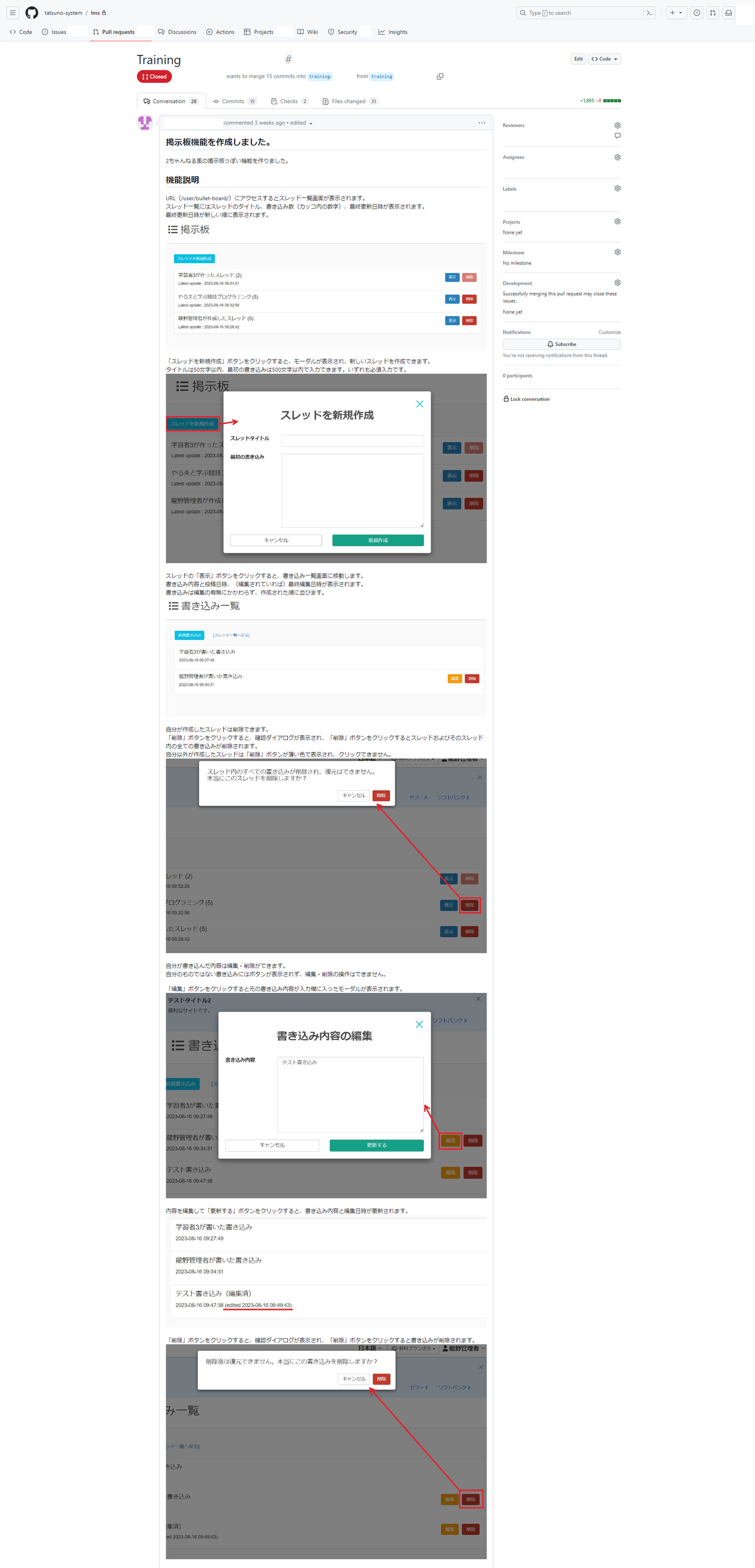 実際に作り始めてからは、未経験だったこともあり分からないことの連続でした。ただ、learningBOXのプロダクトコード・先輩方が過去の研修で作った作品・共有ドキュメント・Slackでの過去のやりとりなど、参考になる資料がたくさんあったこと、1か月目の研修でサービスについての知識も付いていたことに加えて、調べても分からないところは先輩が丁寧に教えてくれたので、苦戦しながらも何とか実装を進めていくことができました。掲示板機能ができて、最初のプルリクを出したときはとても達成感がありました!もちろんレビューではたくさん指摘をいただきましたが(笑)