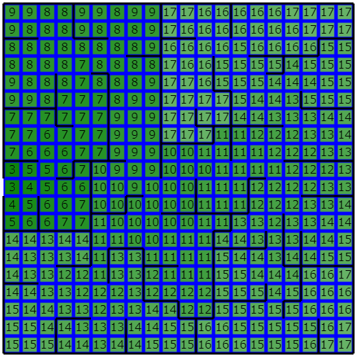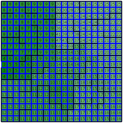得られた距離の情報をもとに、距離が近い順に収穫日が近い種を蒔くことで、以下のような結果が得られました。緑部分は収穫日がD_kの作物が植えられていることを表します。波紋みたいで面白いですね。