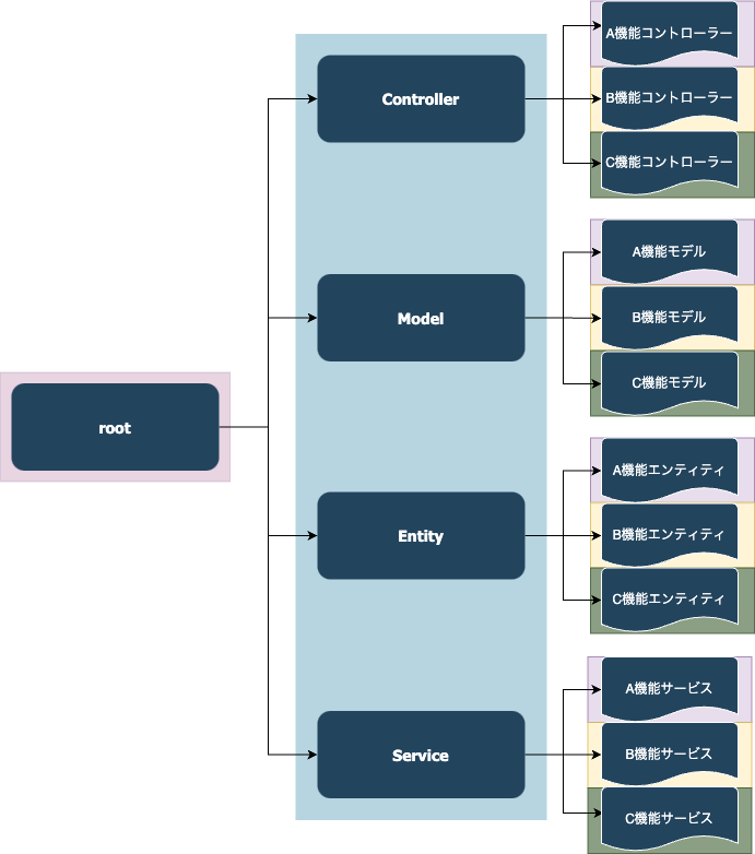これはPackage by Layerといい、MVCで一般的に用いられることが多いディレクトリ構造です。