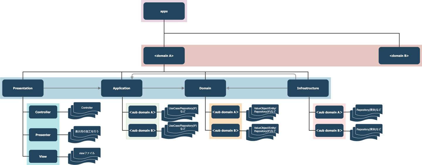各ドメイン毎のディレクトリの中に「プレゼンテーション層」「アプリケーション層」「ドメイン層」「インフラストラクチャ層」の4層構成にして、各層の役割は以下のように定義しました。