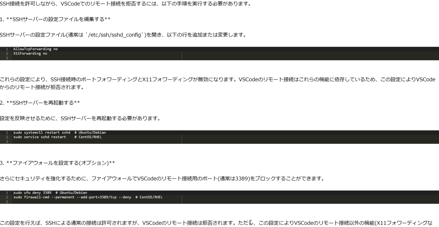 Claude 3 Sonnetに問い合わせたところ、以下のような回答が返ってきました。そして、これの1番の設定を実施することで、一般的なSSHクライアントからの接続を許容しつつ、VSCodeからは接続できない状態を実現できました。