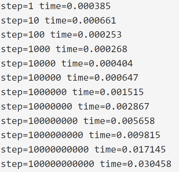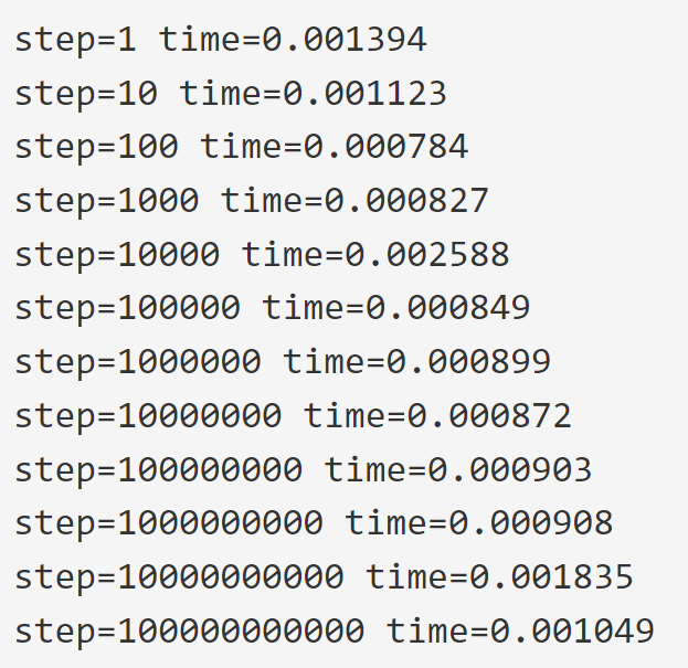 コード例1を実行すると実行結果1のようになります。間隔が10000ぐらいまでは0.3ms程度で安定しています。1秒当たり3000万回程度実行できています。メモリ確保が必要な処理であることやスクリプト言語であることを考えると悪くない速度です。しかし、それ以上間隔が広がると性能がおち、間隔が10^11の場合は間隔が小さい場合と比べて100倍ぐらいの時間がかかってしまいます。1秒間に30万回です。遅いです。AtCoderだとTLEします。しました。(この測定では簡単のために等間隔でやってますが等間隔でなくても同じようになります。Indexを浮動小数点数にするとやや違った傾向になりますが、抜本的には変わりません。)