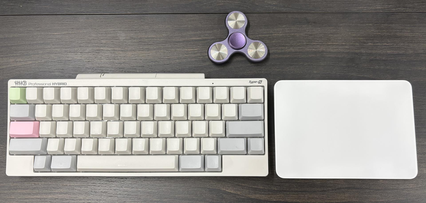 ちなみに私は最初から左手小指の位置(写真中のピンクの位置)に ctrl キーが割り当てられている HHKB (Happy Hacking Keyboard) を使っています。右の白い板はMagic TrackPadです。ズームやスワイプ操作を多用するFigmaを見る際に重宝しています。