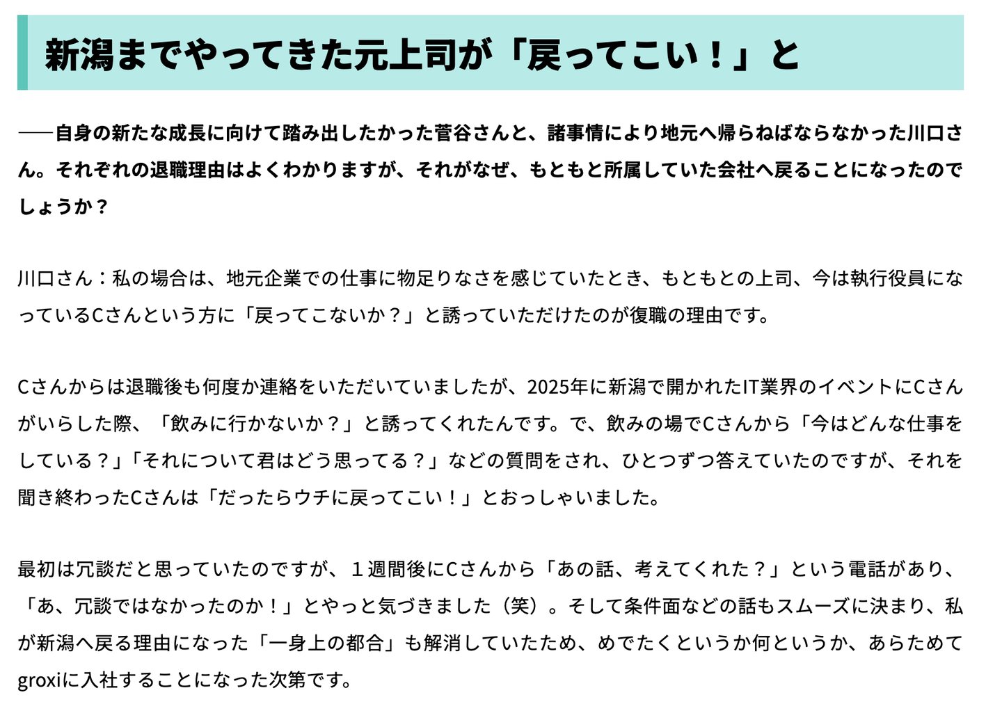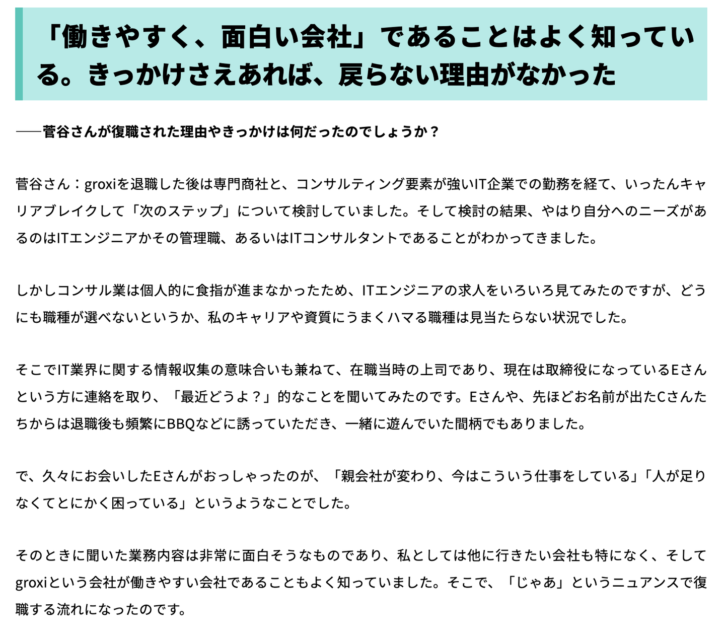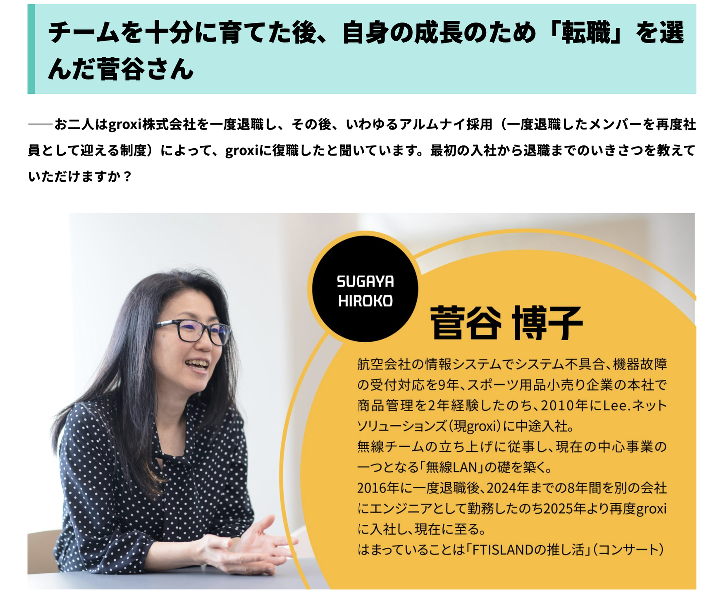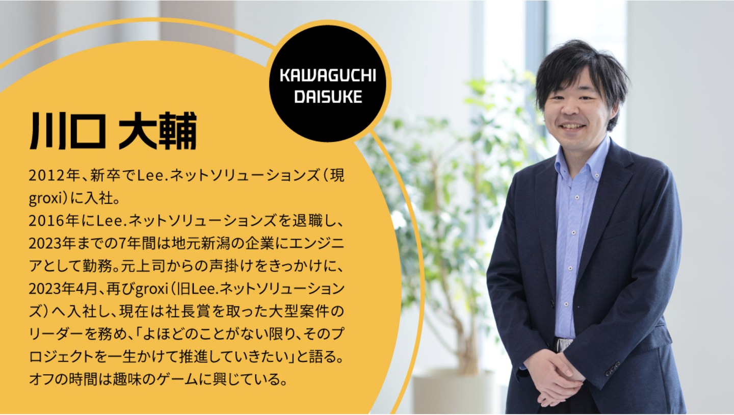 そんなgroxi株式会社では、さまざまな理由でいったんは退職したものの、再びgroxiに社員として戻ってきたエンジニアも少なくないとのこと。人はなぜgroxiに“出戻り”したくなるのでしょうか? 2016年に一度退職した後に復職したソリューションビジネス第2部の菅谷博子さんと、同じく2016年の退職を経て出戻ったソリューションビジネス第2部の川口大輔さんに伺いました。