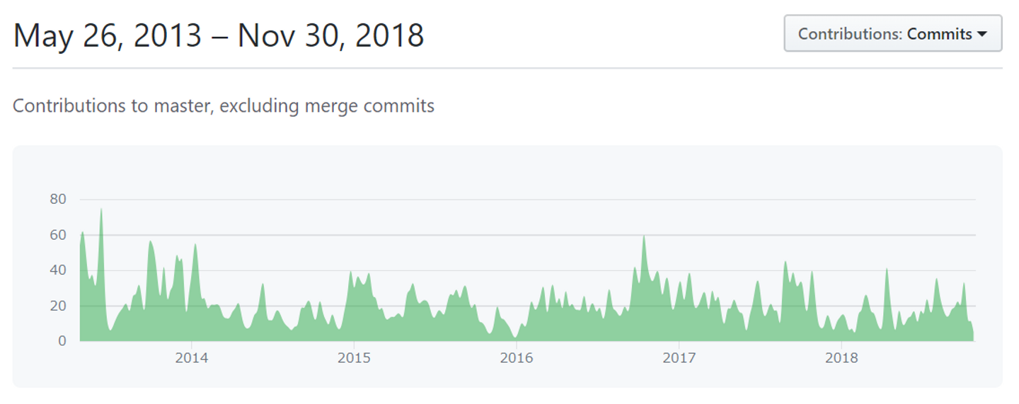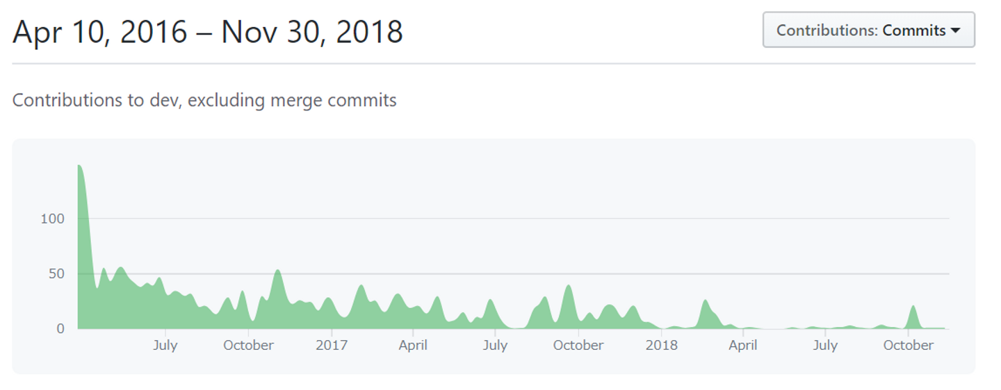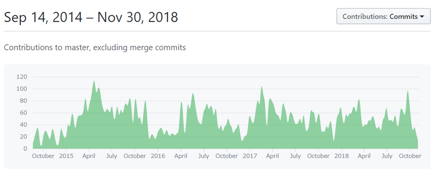 まず(1)に関して、GitHubのコミット数の推移を比較しました(画像は、各GitHub上のページを本記事用に最近キャプチャしたものを掲載しています)。Vue.jsは、一時期の盛り上がりに比べ、最近は開発が落ち着いてきています。AngularとReactは、公開当初から最近まで活発に開発されています。このデータから、Vue.jsは中長期的にはメンテナンスされなくなるリスクがあると判断し、検討対象から外れました。