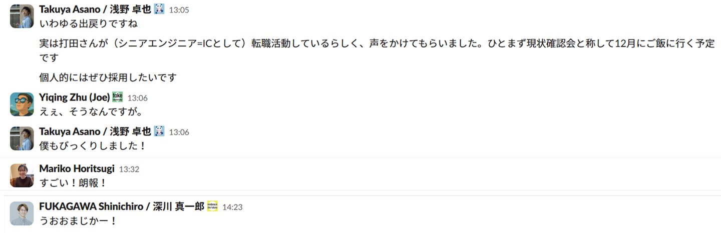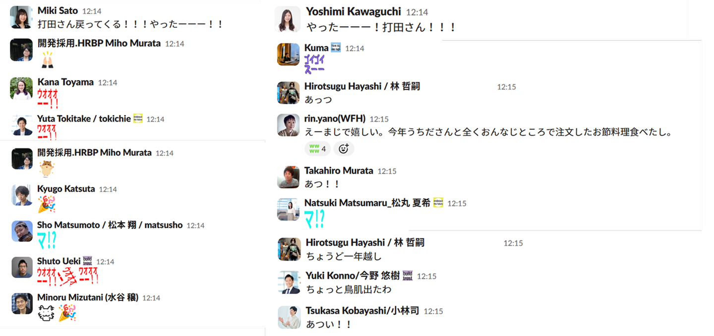 (全社定例で打田さんが戻ってくる共有を受け、興奮冷めやらぬ社員。)
