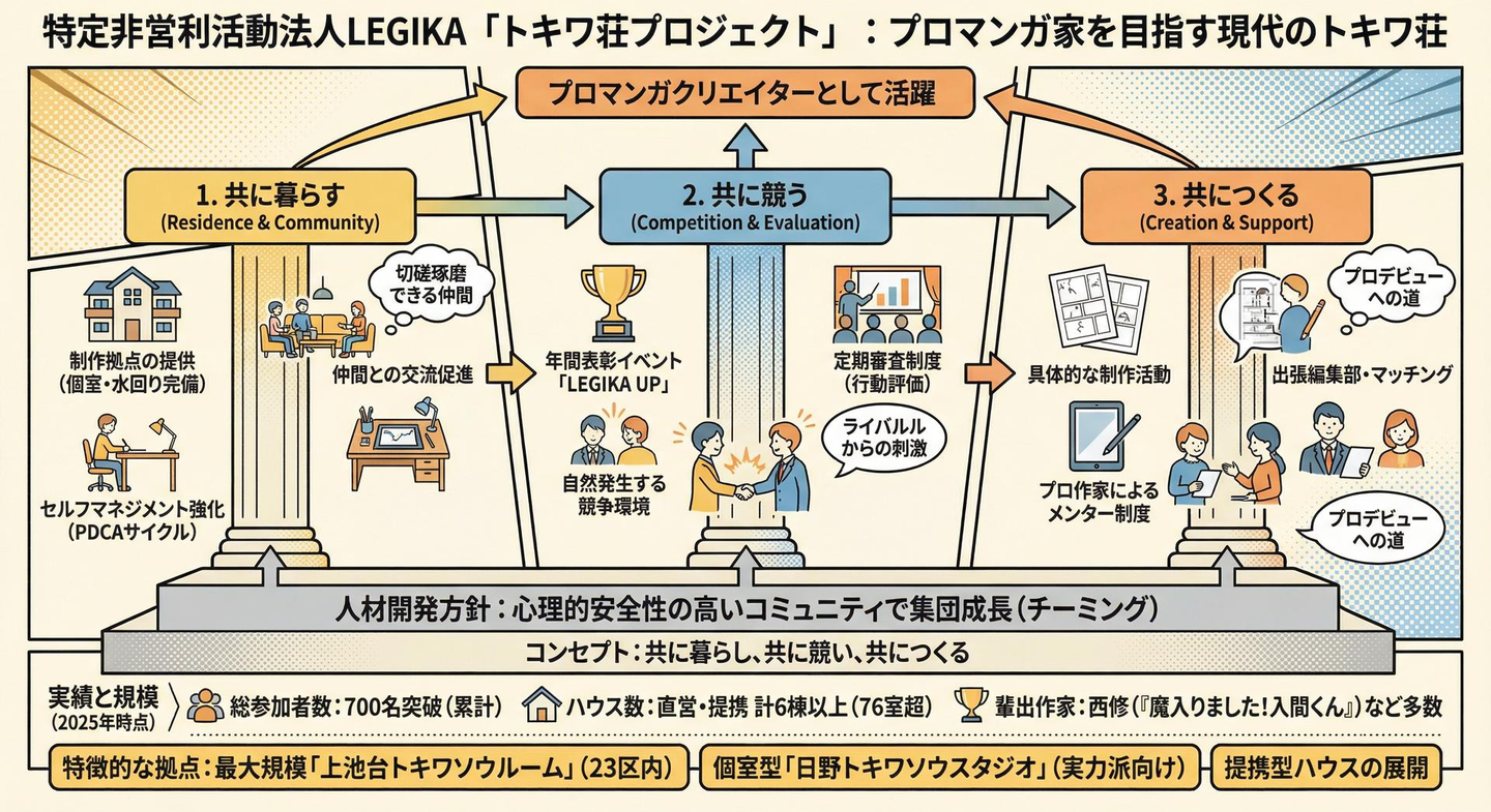 LEGIKAが取り組むマンガ家育成の取り組み「トキワ荘プロジェクト」は、現代版トキワ荘の一つとして取り上げられることが多いです。
