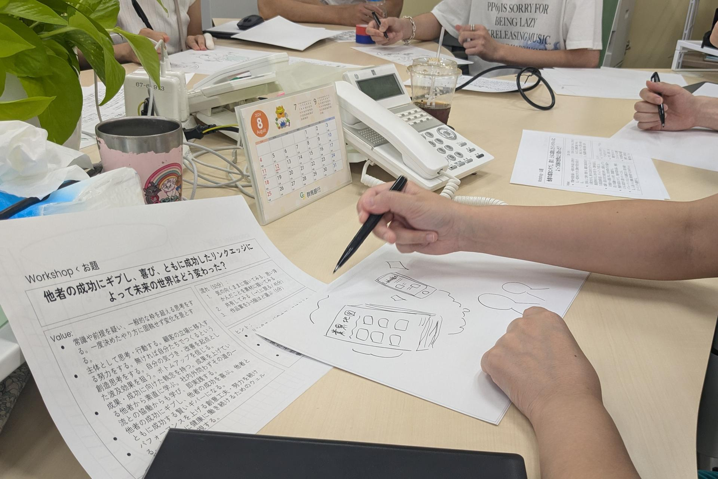 ミッション「常に変革主体となって枠を超え、顧客の成功とともに進化し続ける。」、バリュー「他者の成功にギブし、他社の成功を喜ぶ。他者とともに成功する賢いギバーになる。」を踏まえ、「他者の成功にギブし、喜び、ともに成功している自分の生活空間はどうなっている?」というお題について自由に絵にしていきます。
