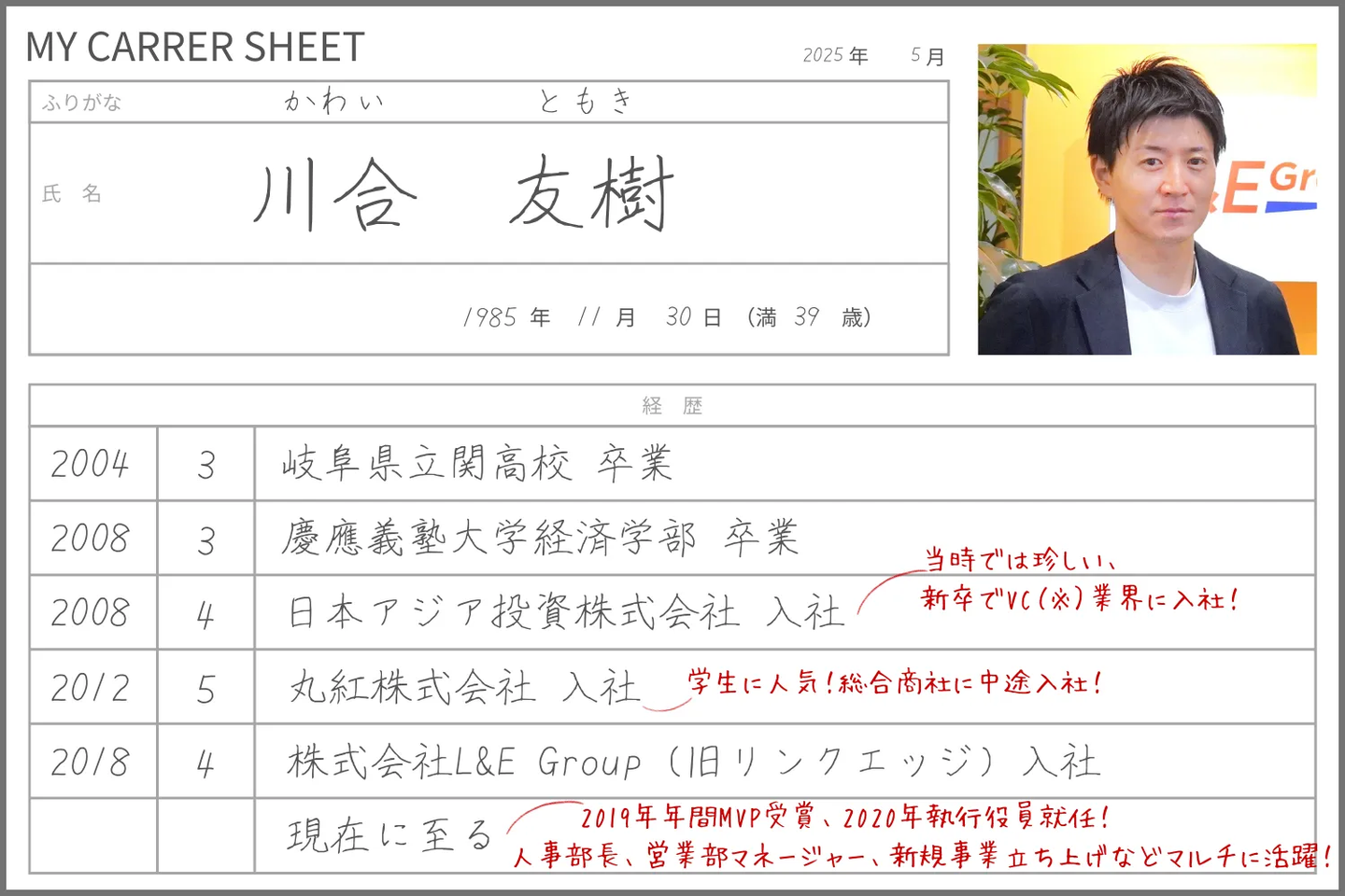 L&E Group(旧リンクエッジ)の経営に携わる役員陣の人柄・キャリアをインタビュー形式で紹介する『MY CARRER SHEET』シリーズ。初回は現マーケティング部長・執行役員の川合友樹さ...