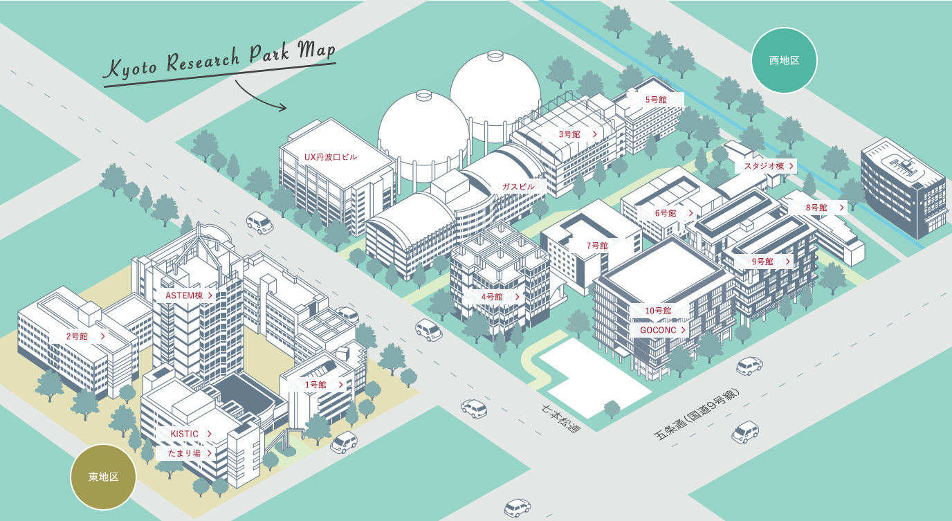 5条通り沿いにある京都リサーチパークは、17棟のビルからなる一大ビジネス拠点です。新事業・研究開発などのイノベーションに向けた挑戦を行う場として、実に500の企業・団体、6,400人のプレイヤーが集っています。
