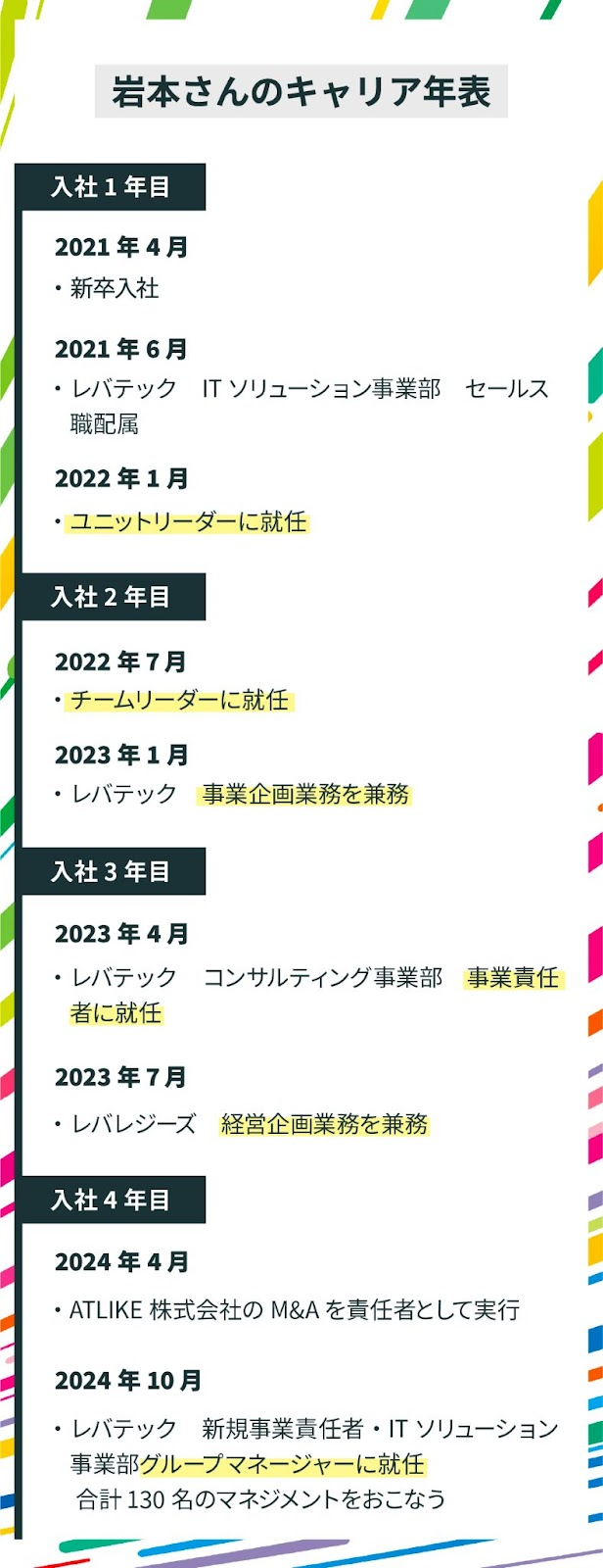 私のキャリアは、半年単位で大きく変化してきました。入社後は「レバテックフリーランス」を運営する、ITソリューション事業部にセールスとして配属。その半年後にユニットリーダー、さらに半年後にチームリーダーを経験しました。その後、レバテックの事業企画室を兼任し、新規事業のリサーチや戦略立案に複数携わりました。そして、自ら調査・戦略立案した新規事業であるDXコンサルティング事業部をレバテック内に立ち上げ、その事業戦略の一環としてM&Aの実行を検討。レバレジーズの経営企画室を兼任しながら、ATLIKE社のM&Aを実現させました。