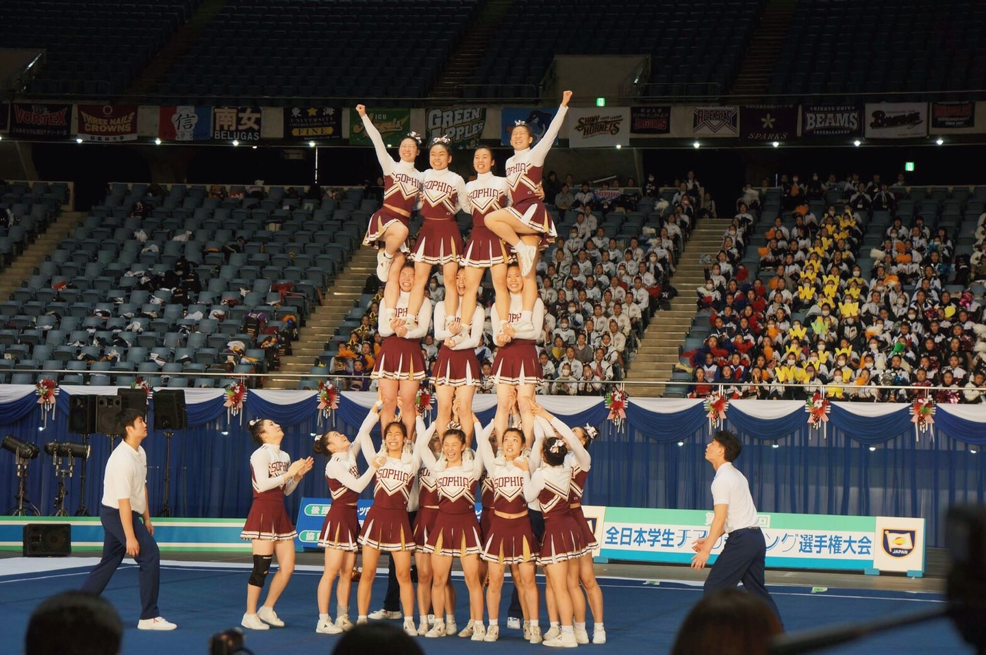 【私は上に乗る子を飛ばして支えているので後ろに隠れてますが、こちら334という大技。最後の大会で決まった時の全身を流れる高揚感、一生忘れません。】