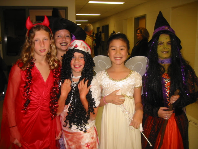 【海外のハロウィンは学校を挙げて行い、みんな本気。魔女、デビル、ゾンビナース(?)に囲まれるエンジェル内田です。私も怖い系で行けばよかったわ~(悔)】