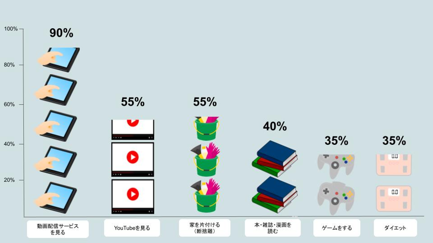 ダントツで「動画配信サービスを見る」が多い結果に!(なんと全体の9割!) コロナをきっかけに、動画のサブスクサービスは一気に需要が増しましたね。海外ドラマやシリーズものを一気見するなんて人も多いのではないでしょうか。