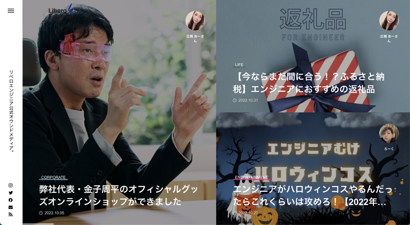 露出リスクを負いやすい代表の僕がパフォーマンスする事によって認知度を上げ、それをきっかけにリベロエンジニアの認知度がアップする。加えて最近では、リベロエンジニア公式キャラクター「遠寺リベロ」を「ファイアーエムブレム」シリーズや「ポケモンGO」のキャラクターデザインなどで活躍する大人気イラストレーター・コザキユースケ氏にデザインしてもらい、メンバーに VTuber 兼 エンジニアとして活躍してもらえるような企画を立ち上げたり、自社メディアを作って個性的なコンテンツを配信したりして、僕だけではなく会社全体として “エンタメ” をキーワードに認知度アップを狙っています。