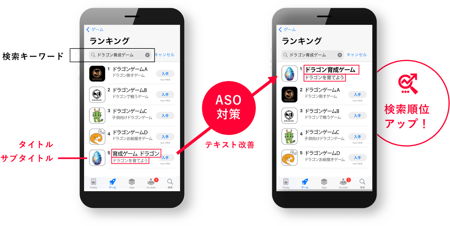 アプリストアに掲載する「タイトル・サブタイトルなどのテキスト」を市場調査から導き出した注力したい検索キーワードに寄せたワードにします。これはアプリの検索順位を上昇させることで、アプリをユーザーに見つかりやすくする認知施策です。