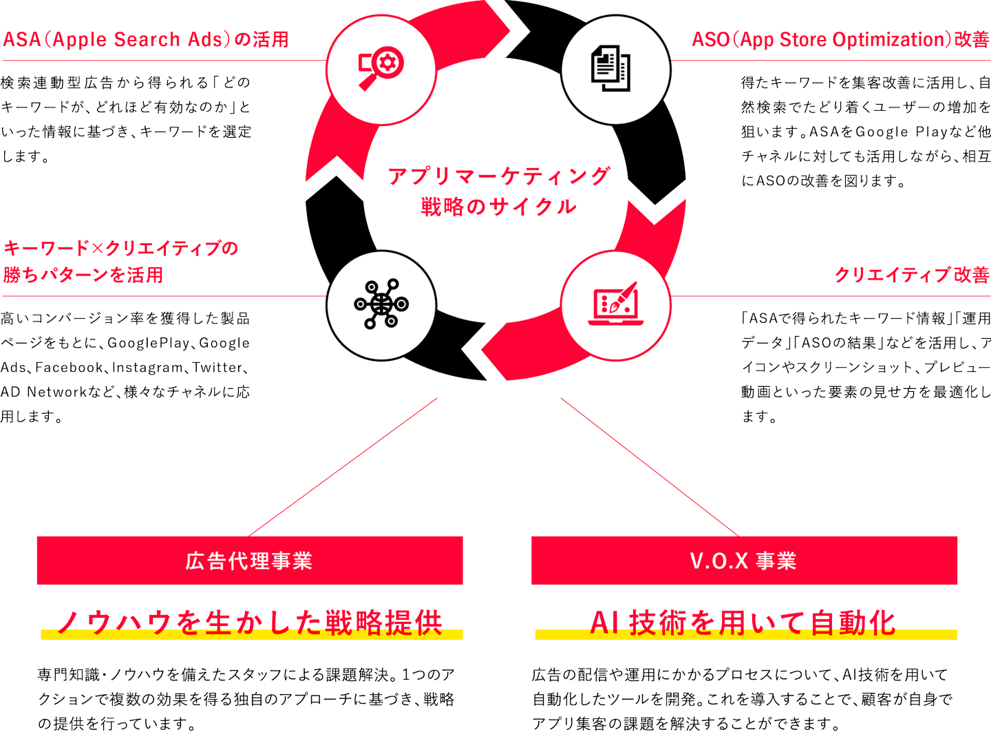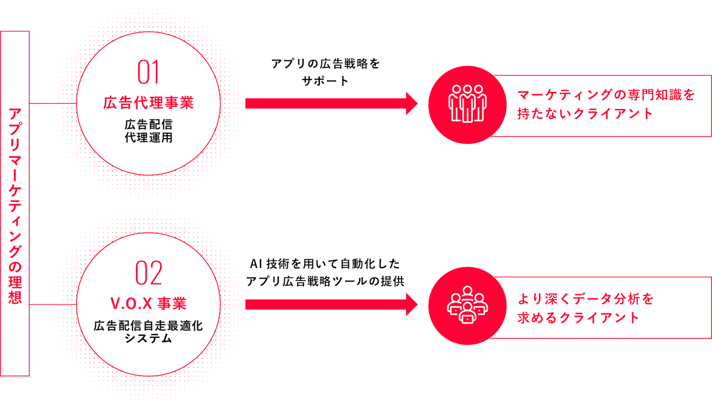 私たちが展開している広告代理事業、そしてV.O.X事業ですが、これらはともにクライアントアプリのマーケティングにおける課題の解決を行っています。